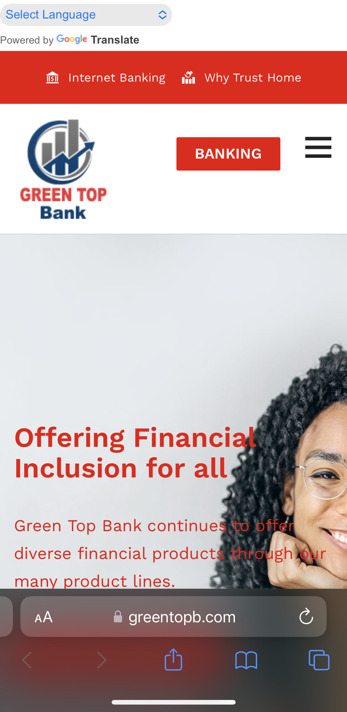 Green Top Bank continues to serve the financial needs of individuals, farmers, businesses, and industries by offering the traditional banking products, as well as online, mobile and telephone banking products.